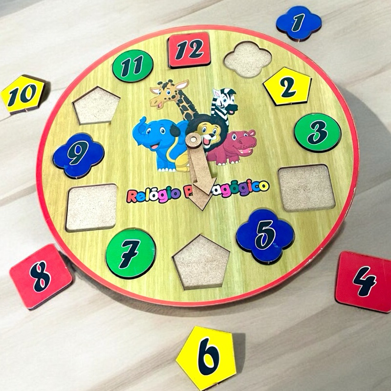 O Brinquedo possui 12 peças encaixáveis na base principal. Cada uma delas com o número impresso e 2 ponteiros.
