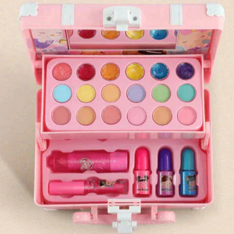 A Maleta de Maquiagem Infantil contém:1 Maleta com alçaDiversos tons de sombraDiversos tons de blushBatomEsmaltePincéis